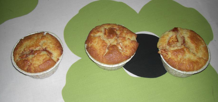 Vispa smör och socker pösigt, rör i äggen och mjölken. Blanda vetemjöl och bakpulver, häll sedan ner det i smeten och rör om. Skala äpplet och skär det i små bitar. Blanda äpplet med kanel och socker. Häll smeten i formar och stoppa i några äppelbitar. Grädda på 200 grader mitt i ugnen i ca 20 min.