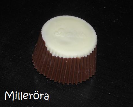 Efter tredje lagret choklad hade jag i min pralin en kola som fyllning. Receptet var inte så bra, därför väljer jag att inte lägga upp det här. Efter kolan fyllde jag upp med ljus choklad så det täckte helt och blev en platt botten.