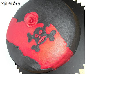 Marsipan hade jag kvar sedan 90-års tårtan, så fick inspireras av färgerna jag hade att tillgå med. J, tyckte en dödskalle och ros passade bra och då fick det bli det.